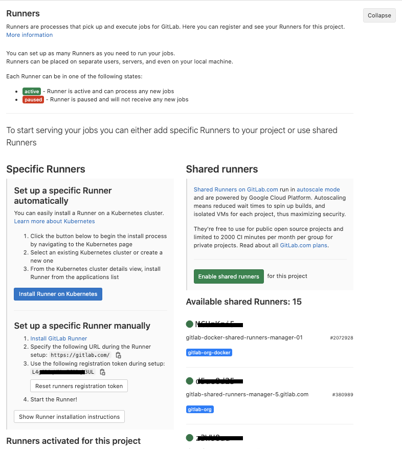 Setting -> CI / CD -> Runners 를 활성화 하면 된다